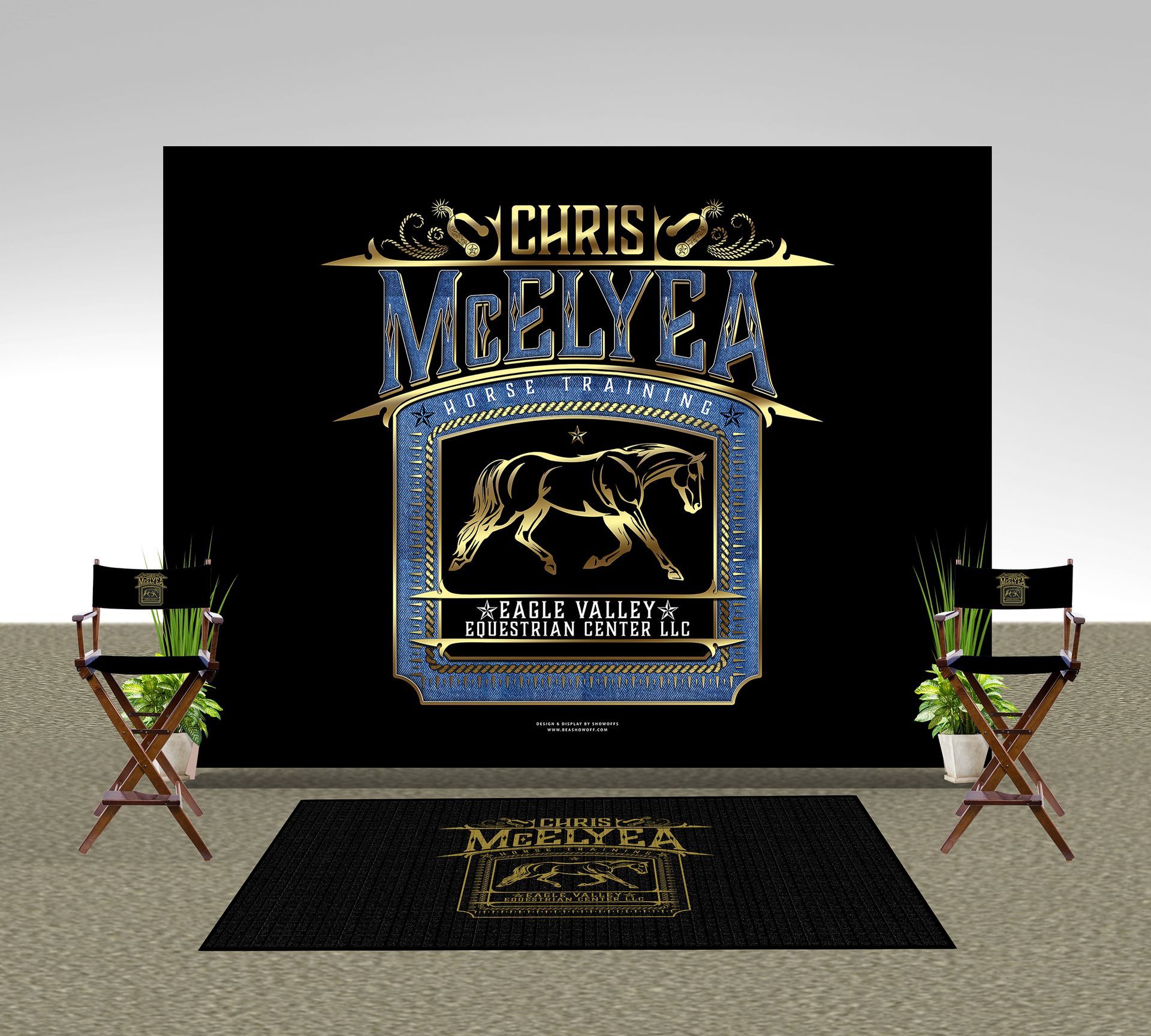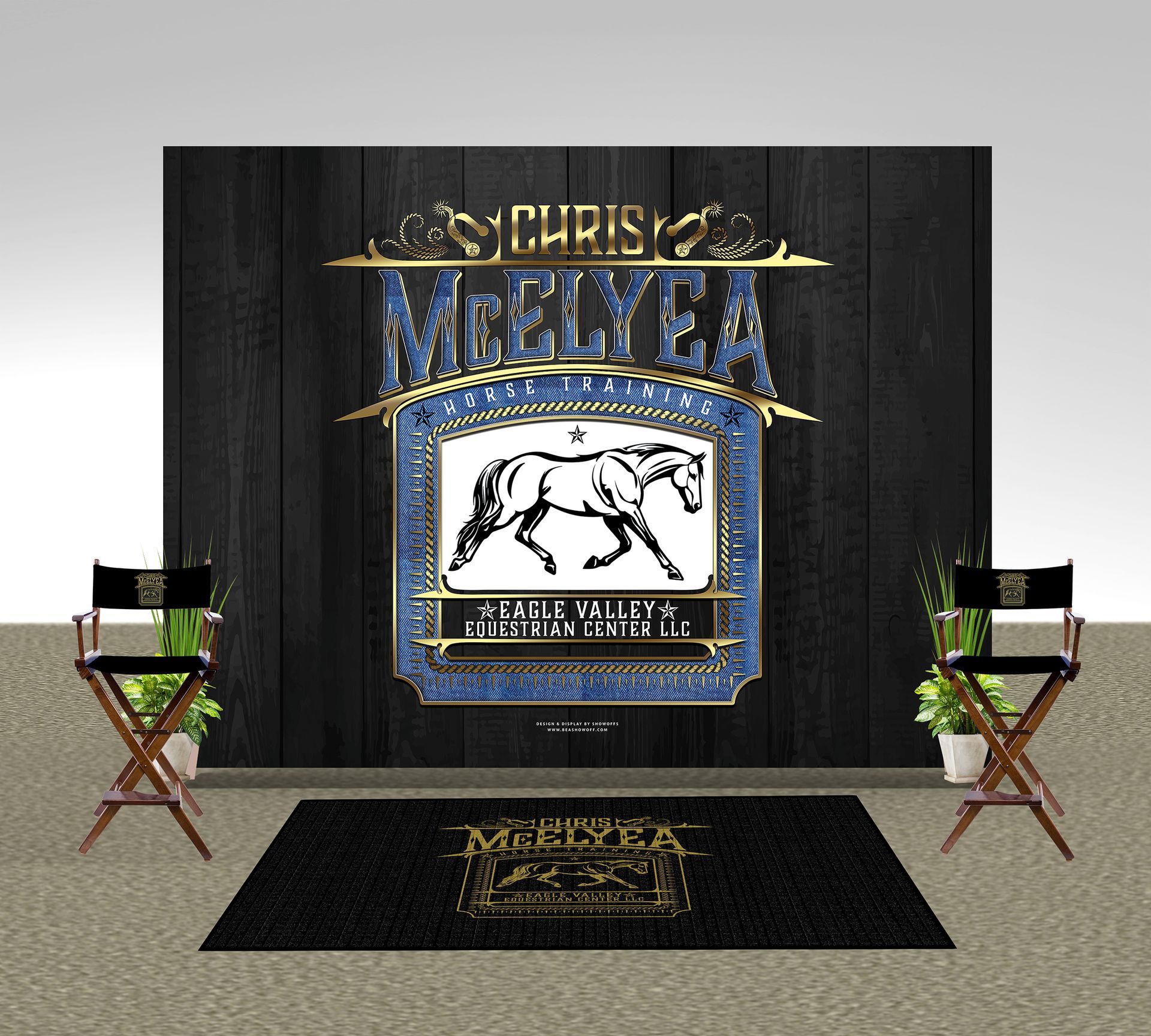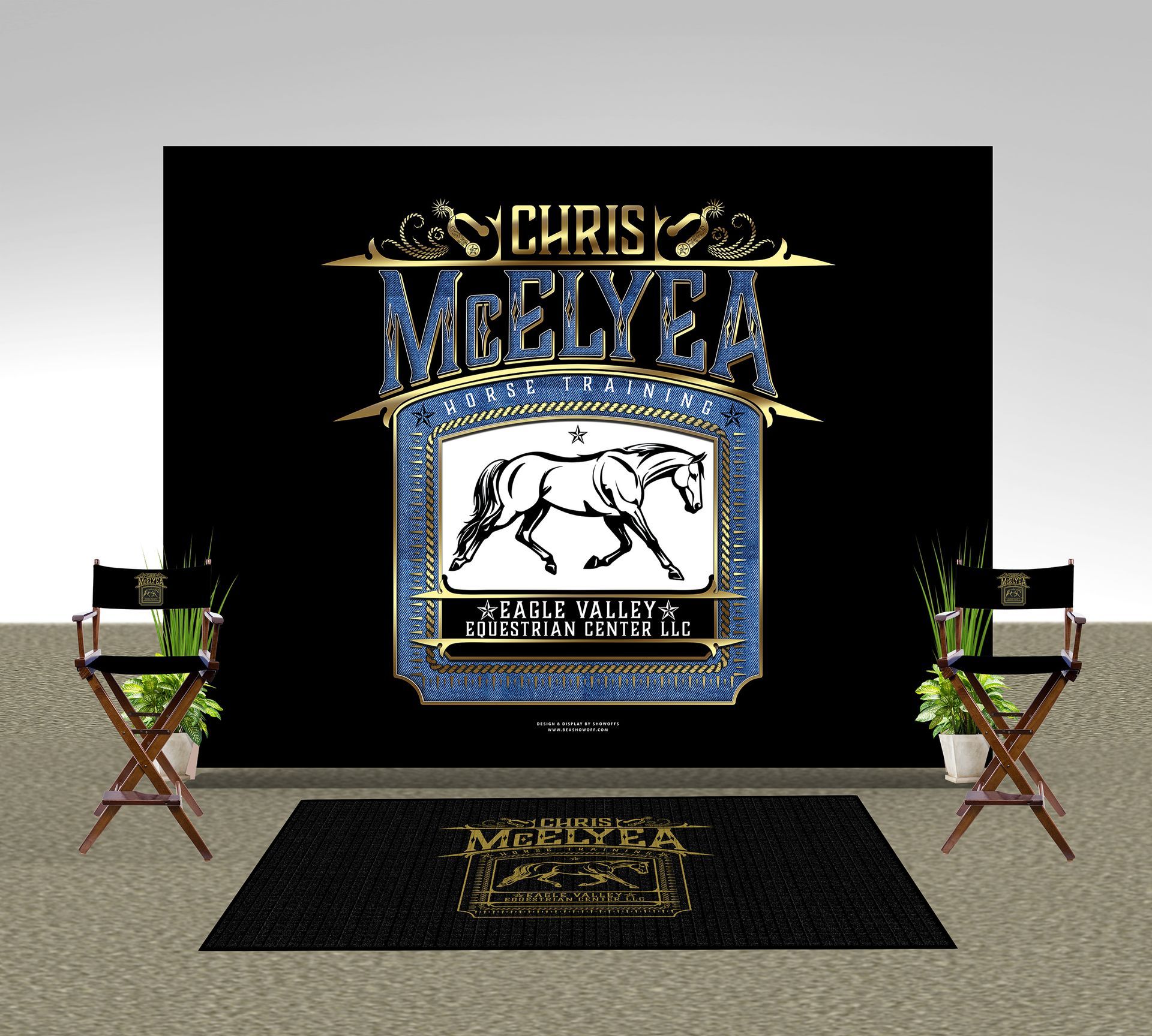 - Logo Mat & Director chairs shown for a full setup look. Not ordered.