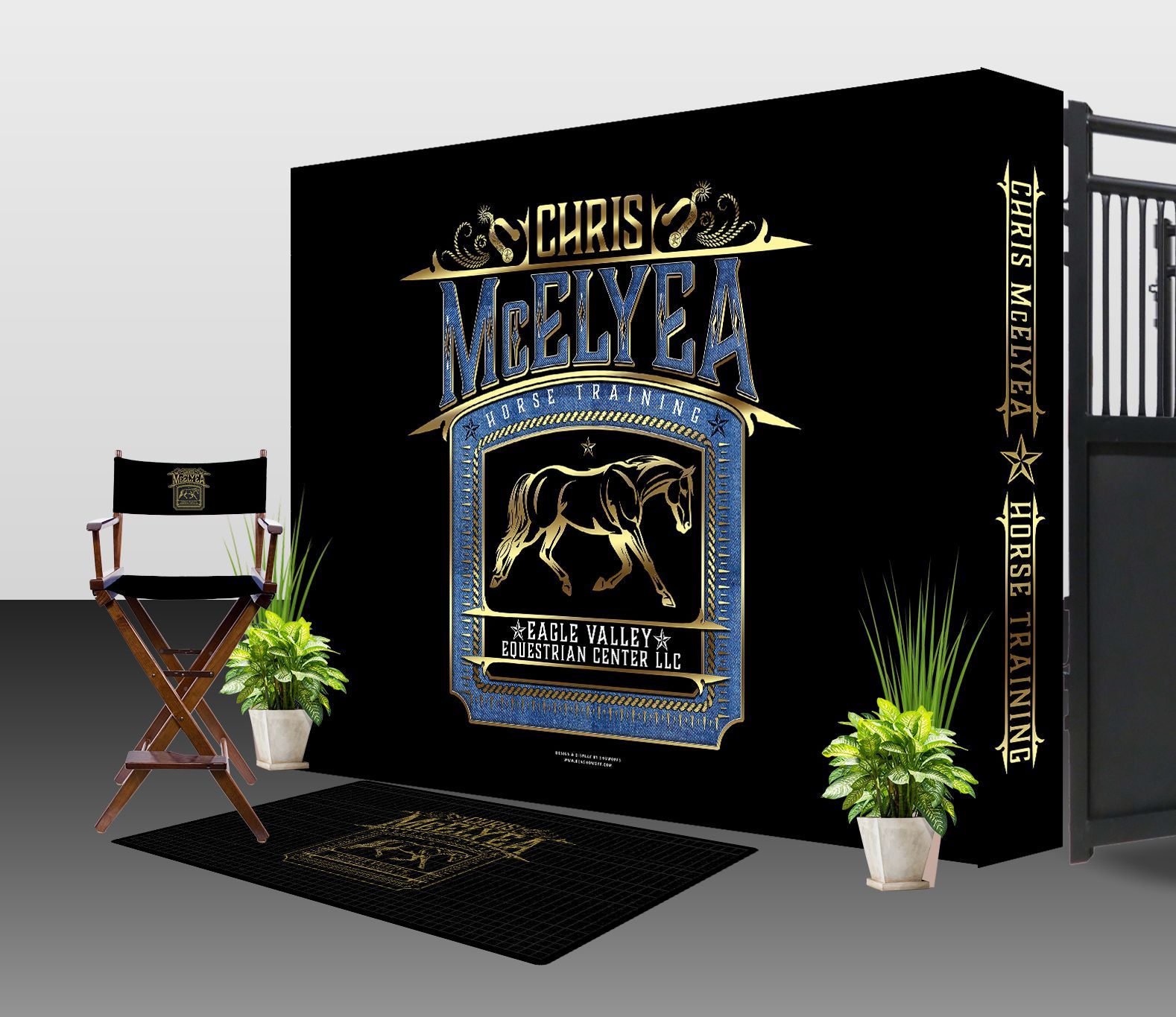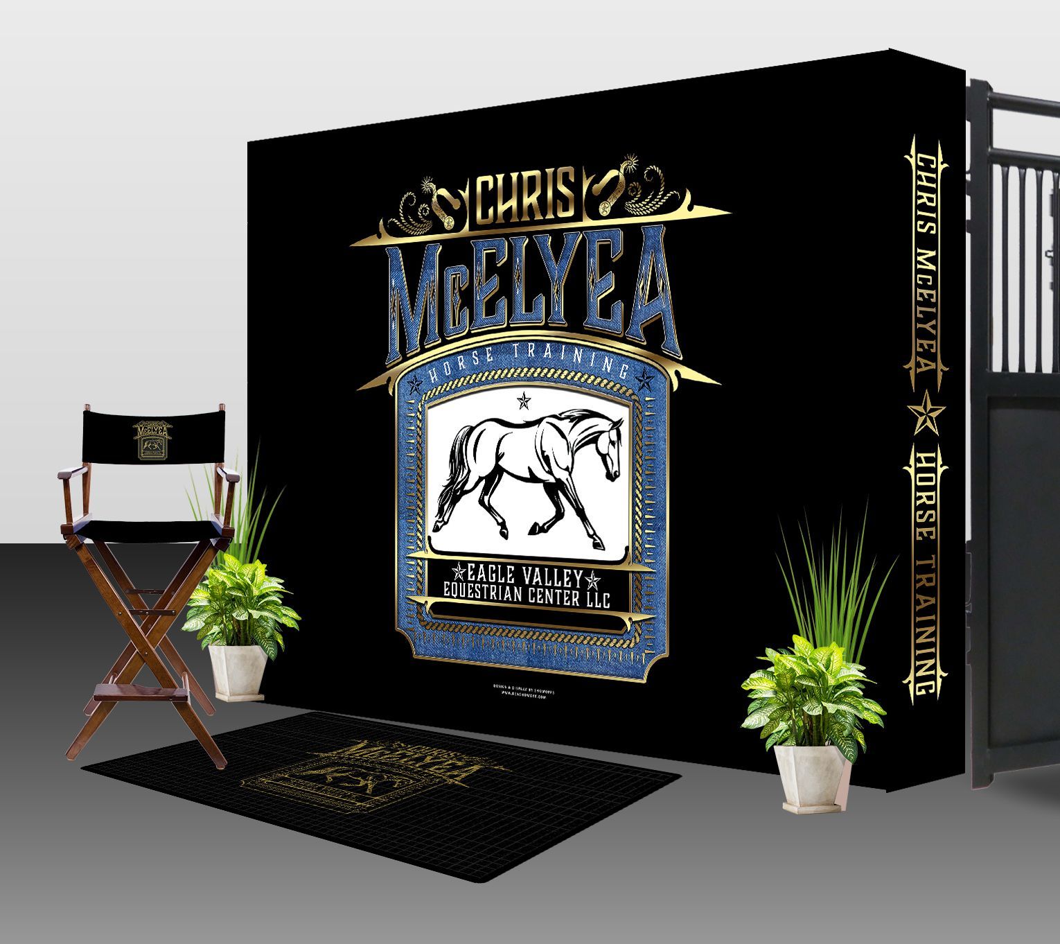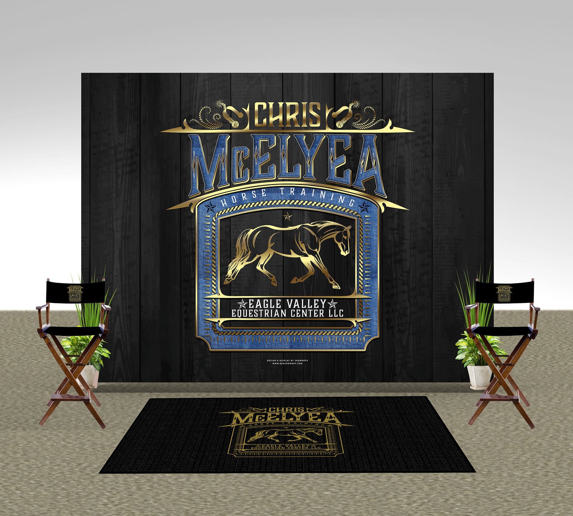 - Logo Mat & Director chairs shown for a full setup look. Not ordered.