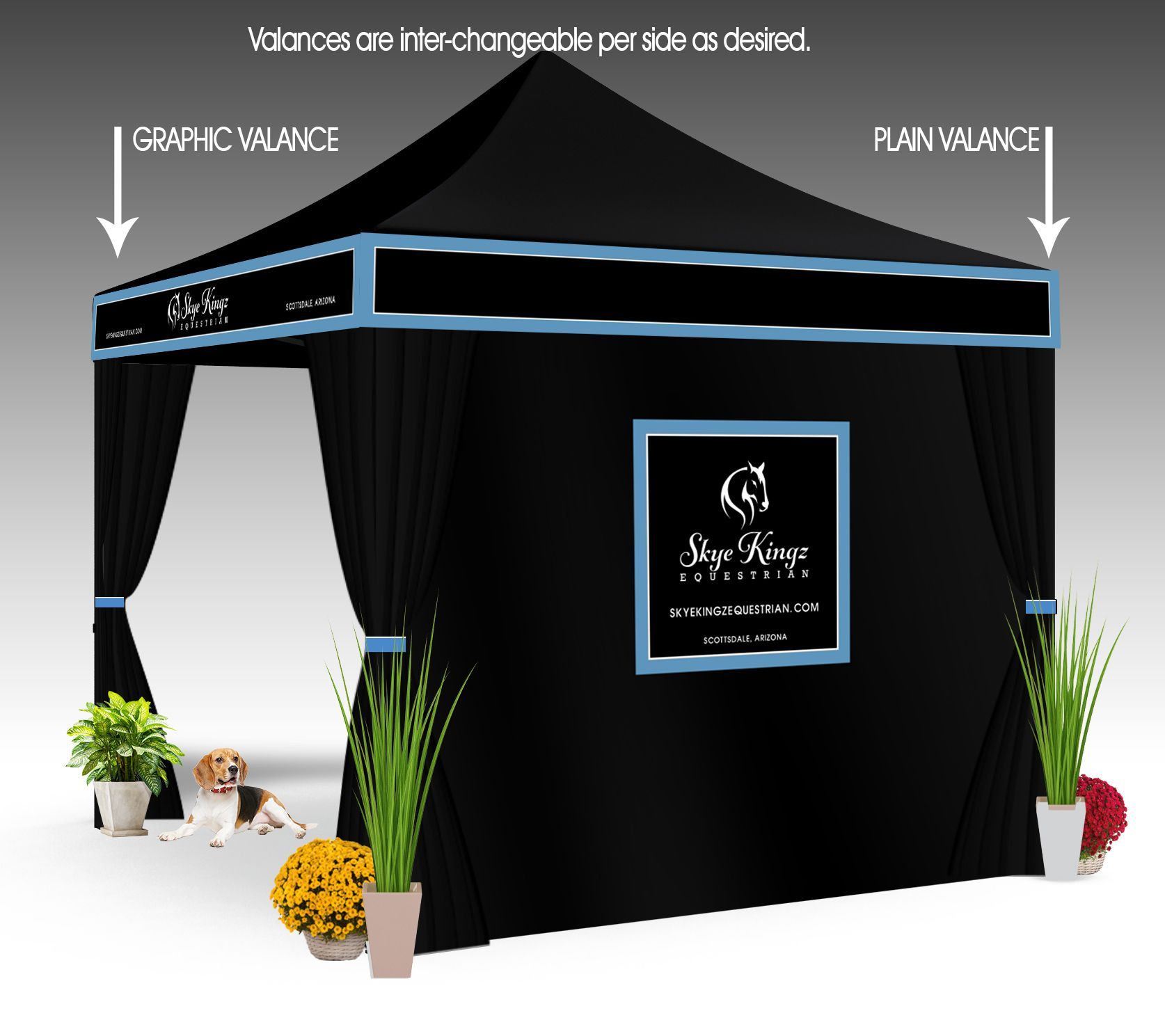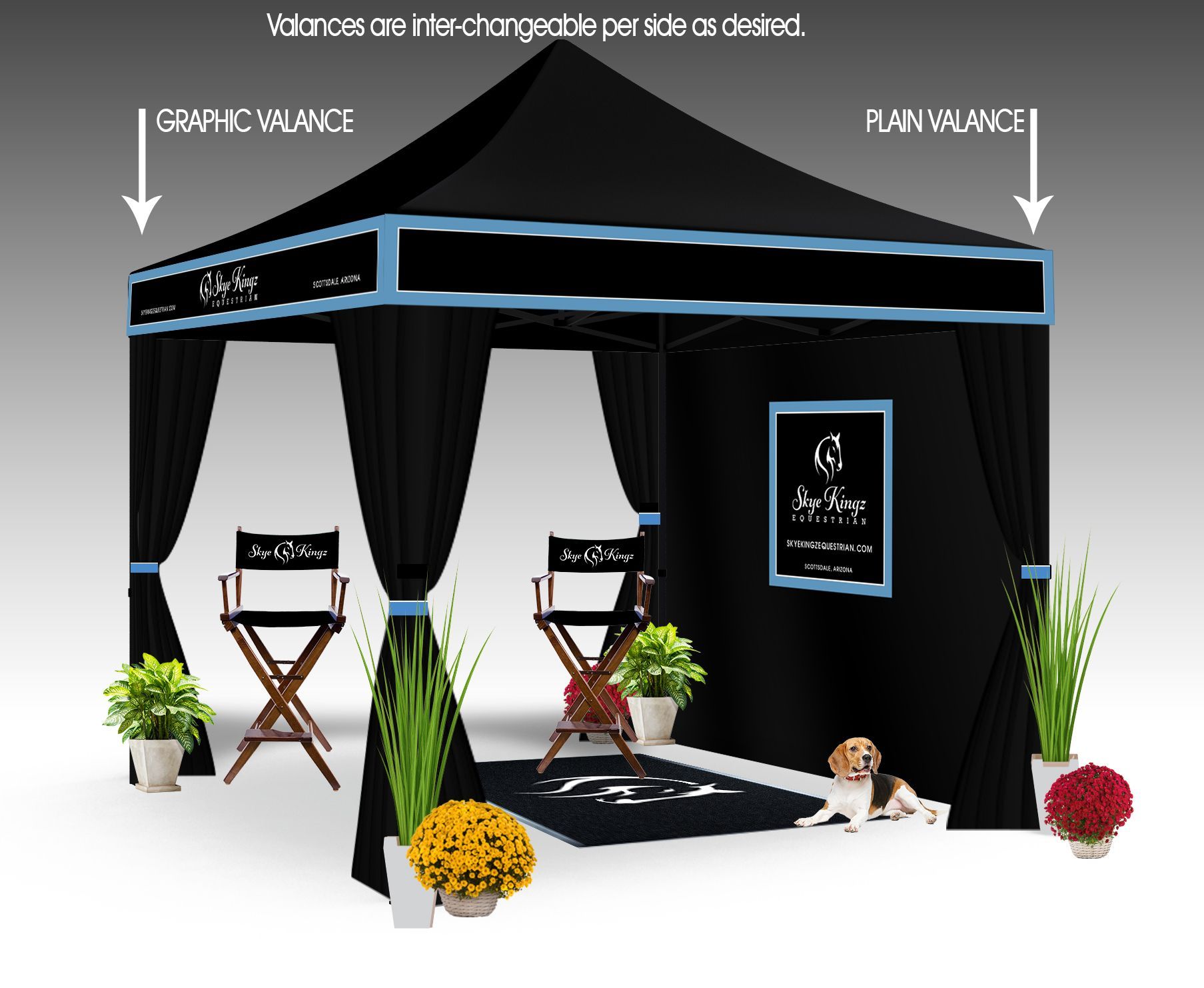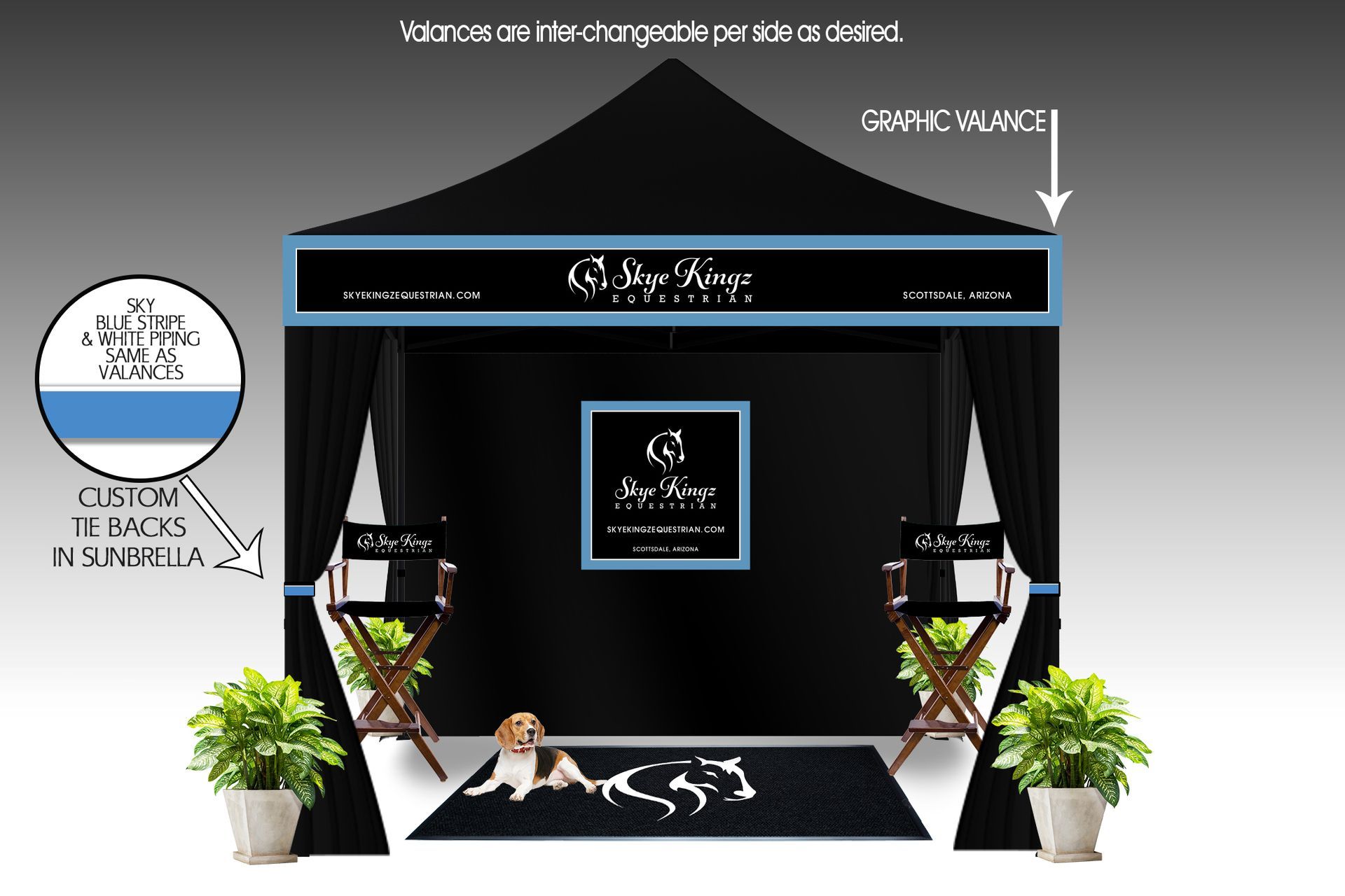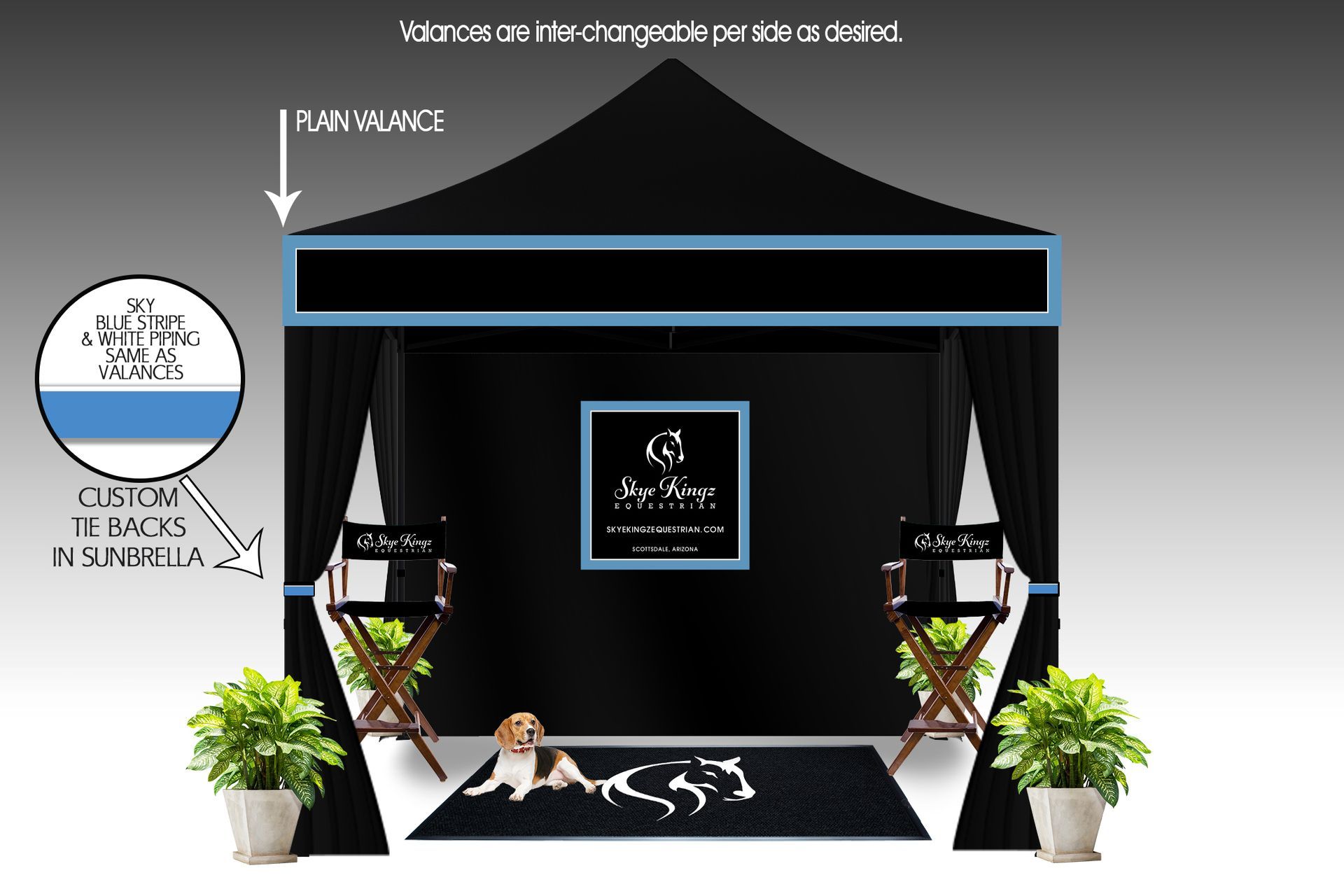 - Tent as Black Canopy with detachable Valance per side. Two with Name and two with just Stripes and piping to match proposed Drape valance. These Velcro on & off. These can be placed as desired.