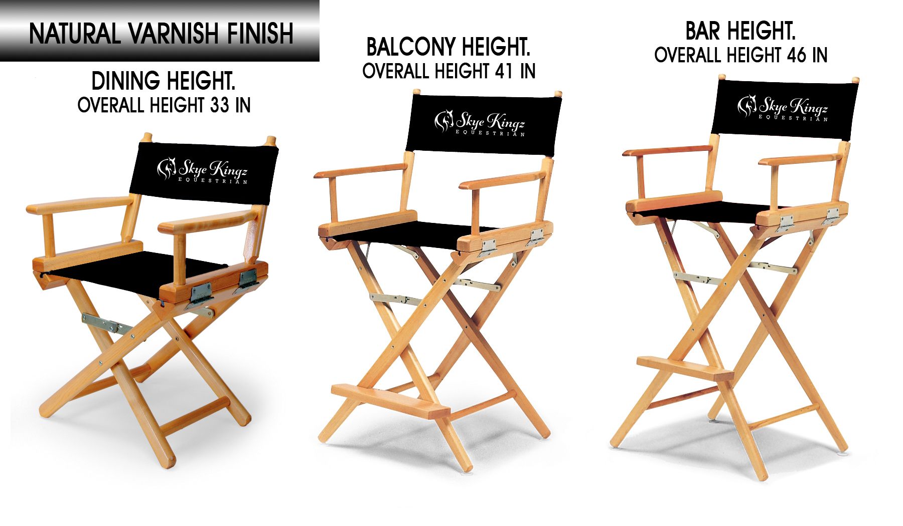- DIRECTOR CHAIRS-All available sizes shown n Natural Finish. Black Fabrics with Logo. Make your Size & QTY selection on approval form if no changes.