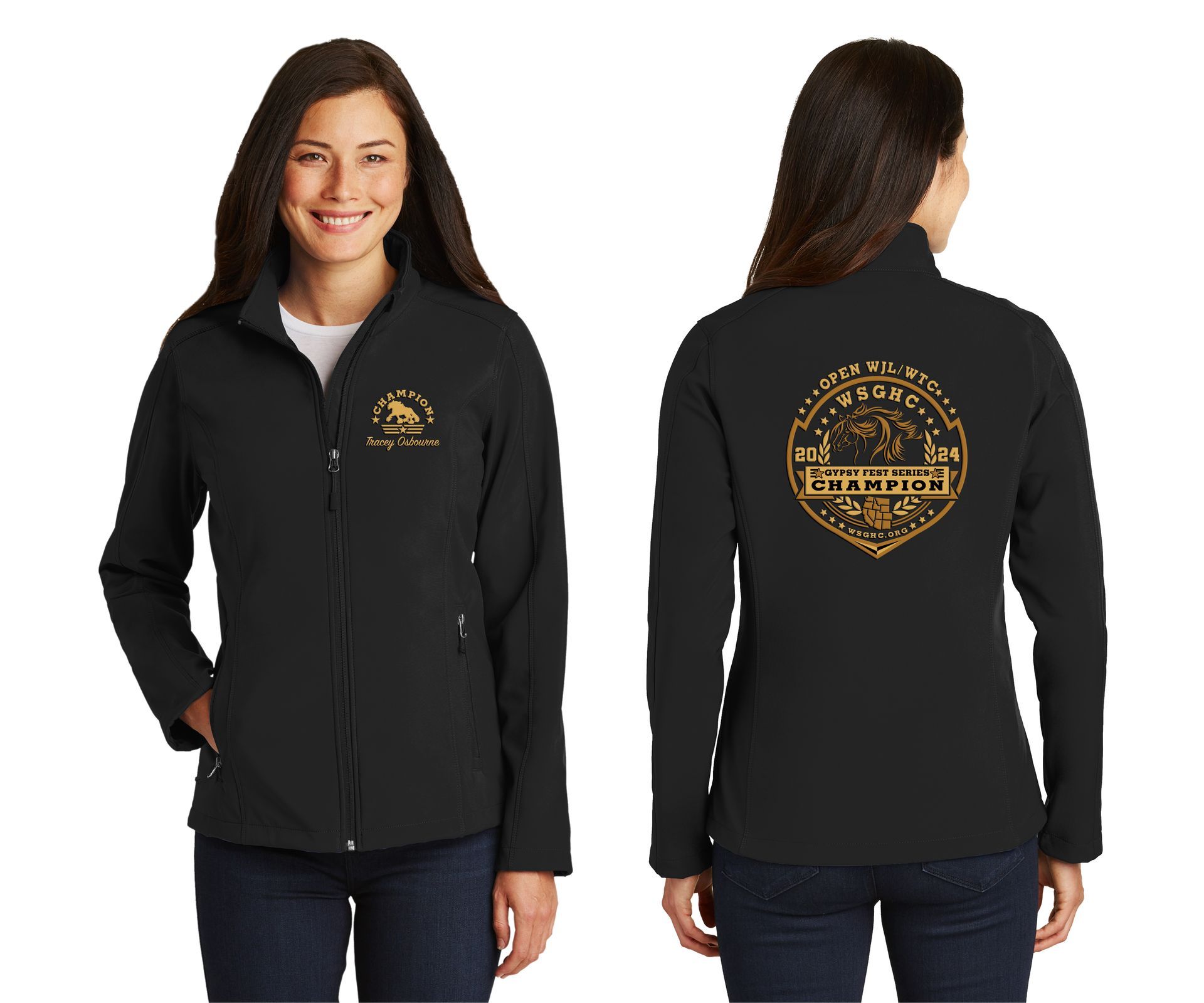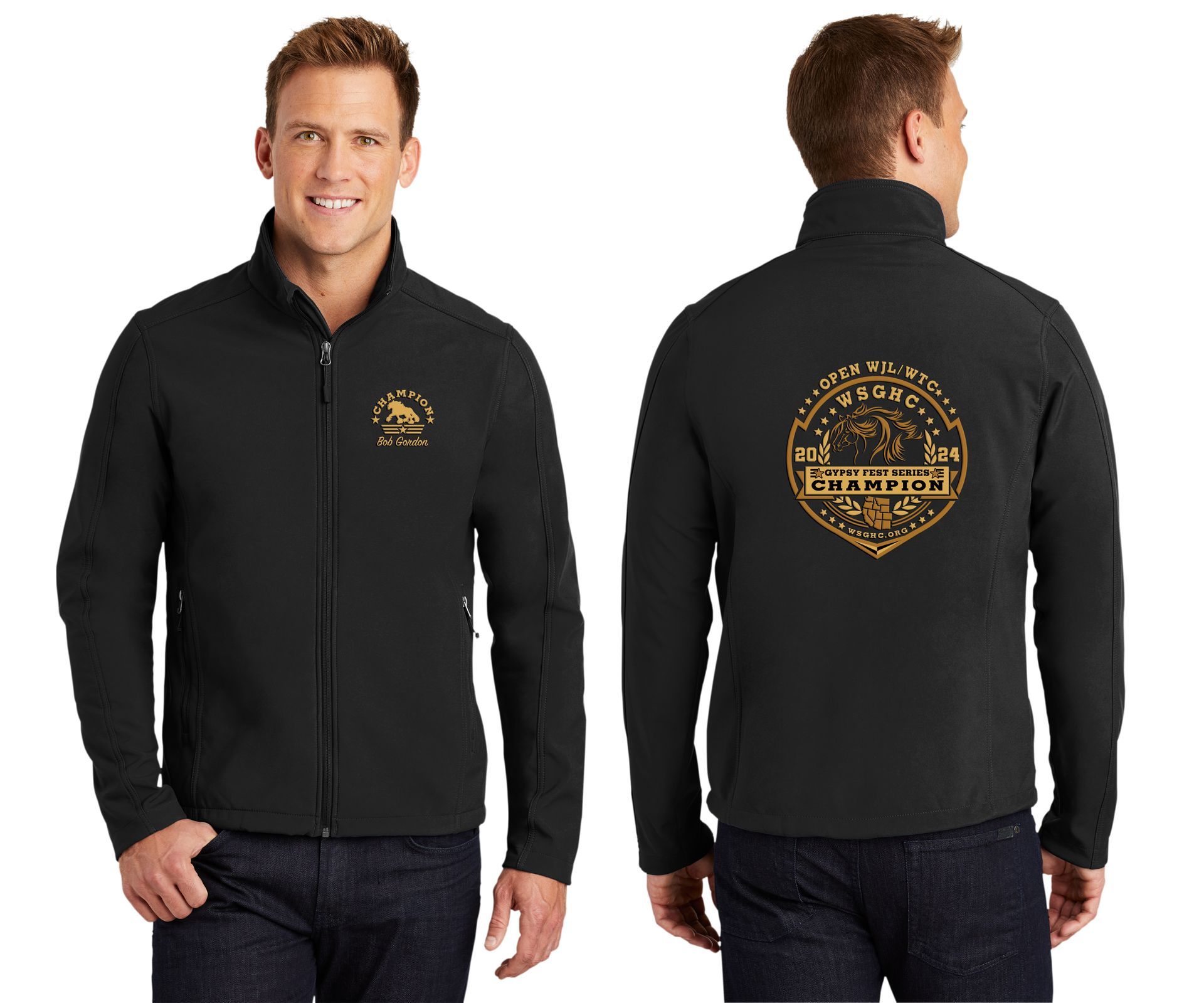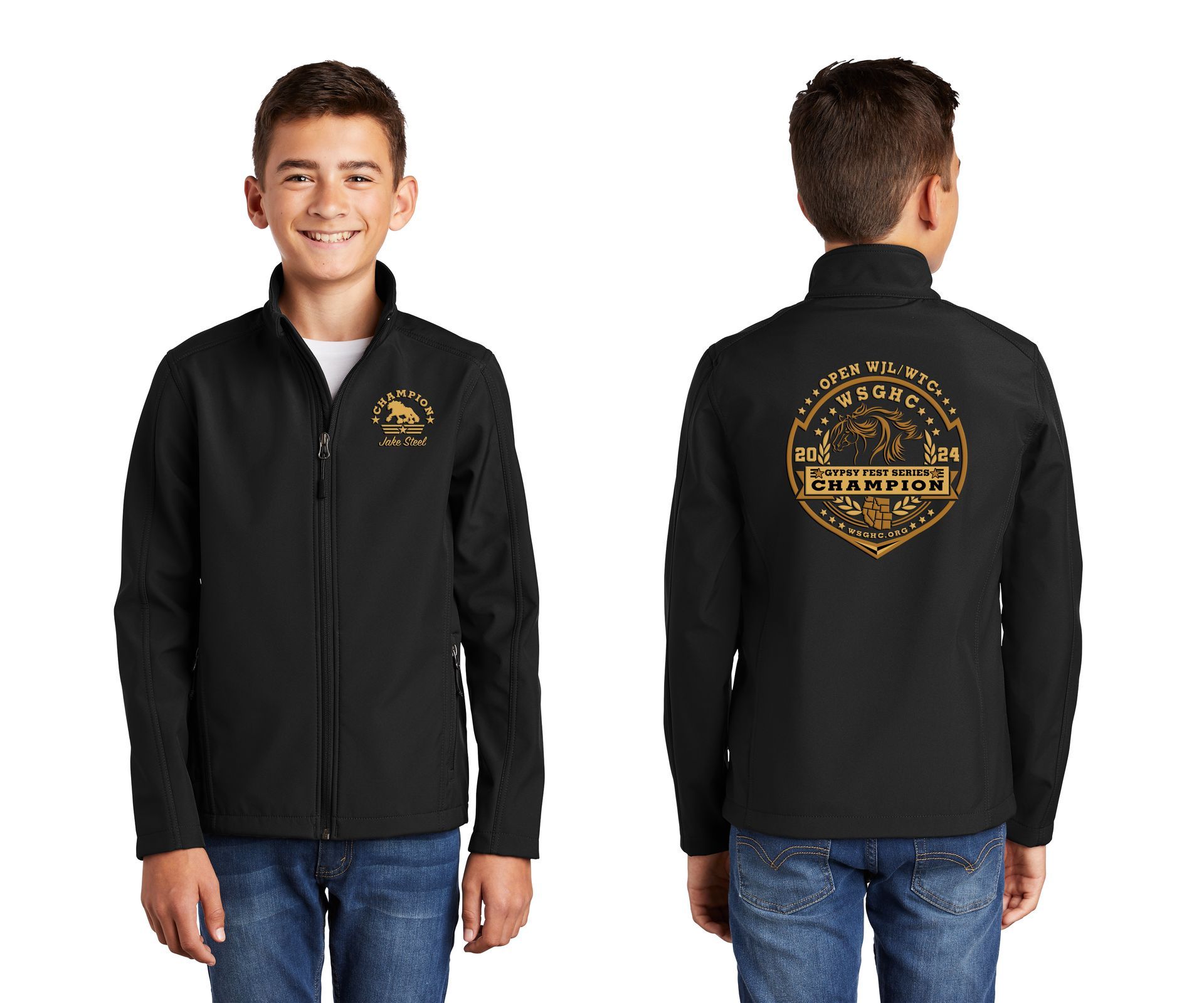 - LADIES, MEN/ADULT & YOUTH Shell Jacket - Embroidered Left Chest with CHAMPION Graphic & Name. Full Award Design Logo with category at top on back. Gold, Gold tone 2nd color & Black Thread.